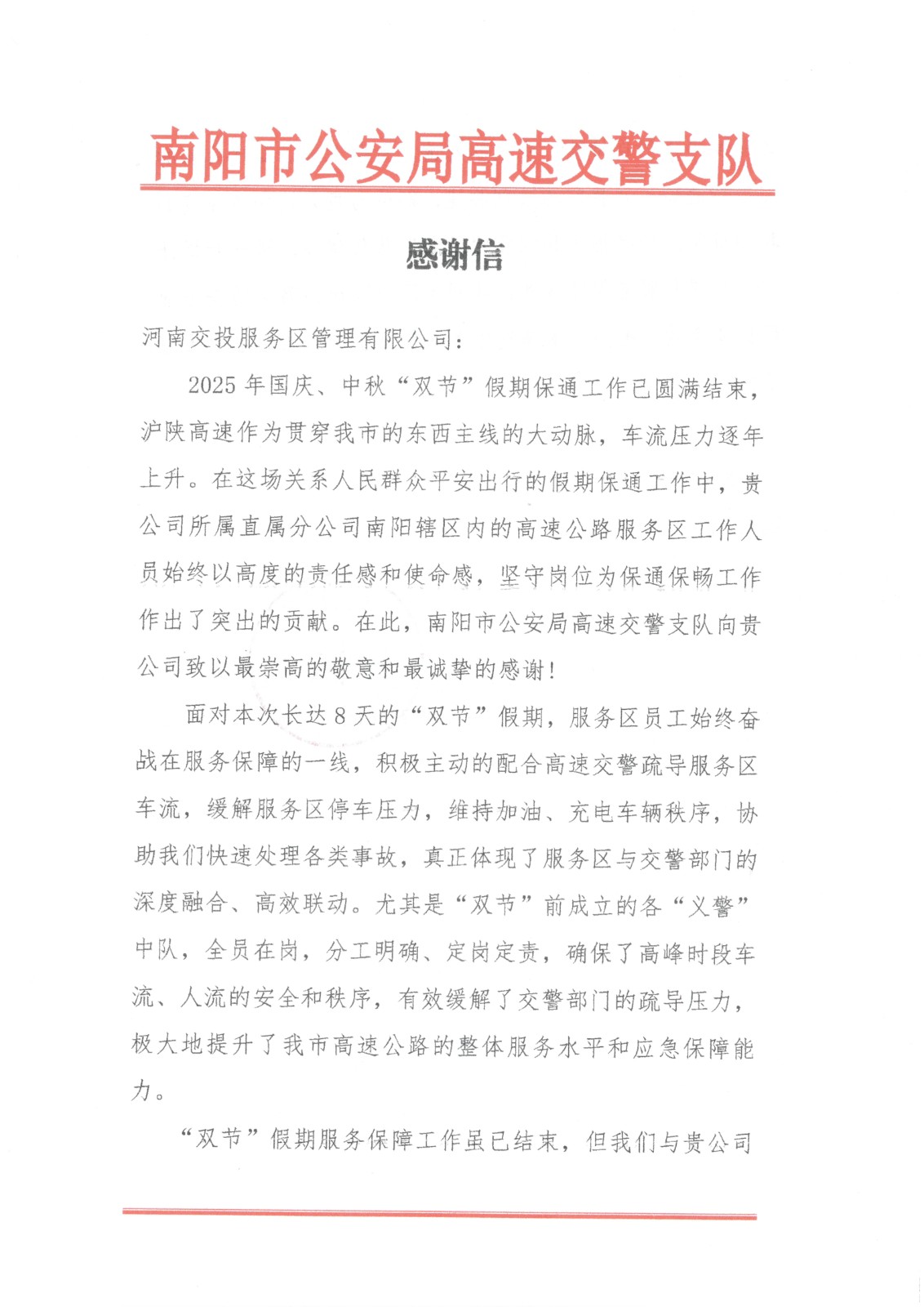 《一封感謝信 濃濃服務(wù)…》 10月10日,南陽市公安局高速交警支隊(duì)向公司所屬直屬分公司寄來感謝信,表達(dá)對(duì)南陽轄區(qū)內(nèi)…